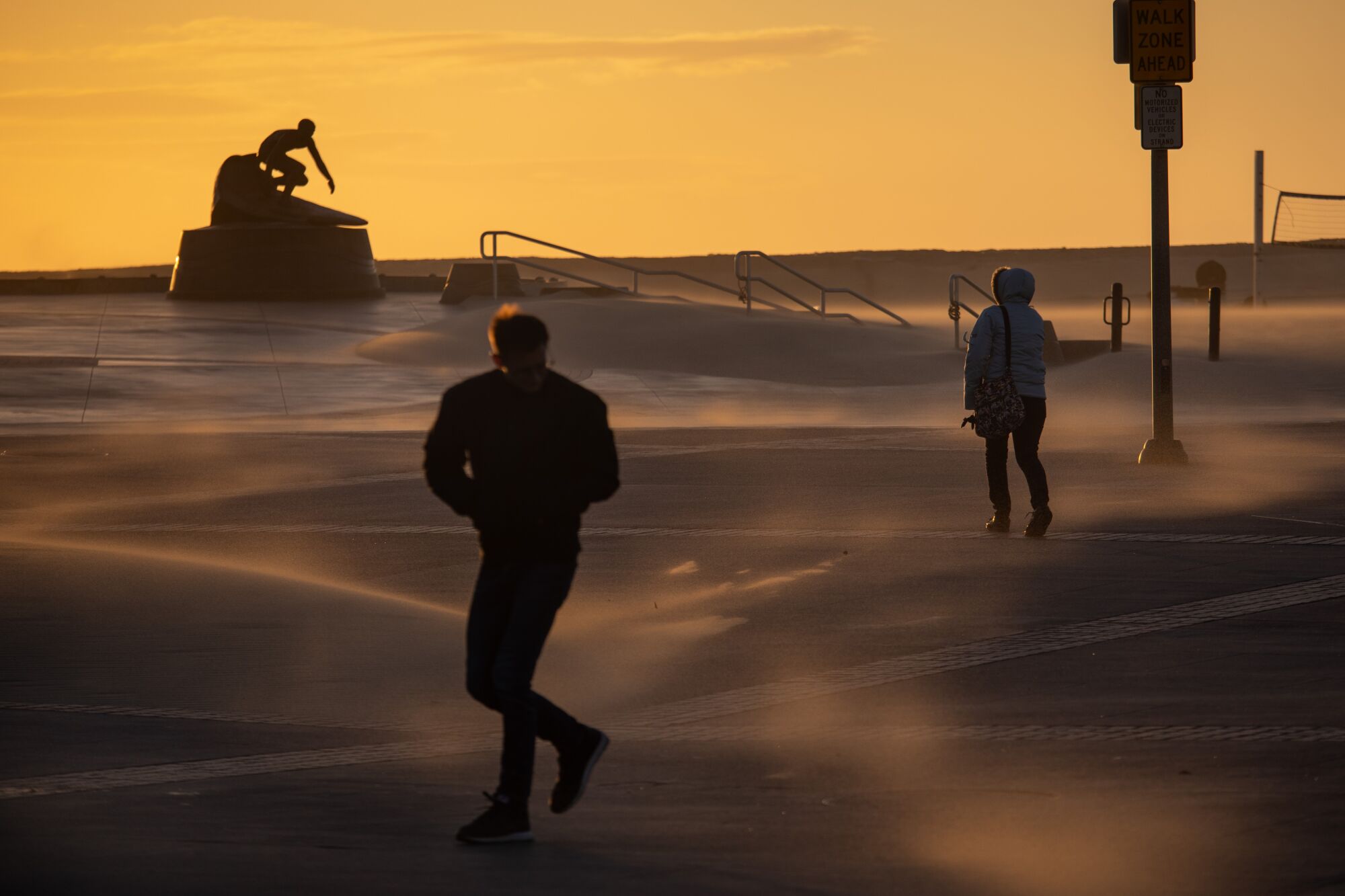 Excessive winds blow sand inland pelting walkers and forming piles alongside Pier Plaza, in Hermosa Seaside, Wednesday.